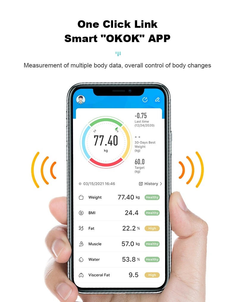 Bluetooth Weight Scale Body Report Analysis and LCD Display, OKOK Mobile Apps.
